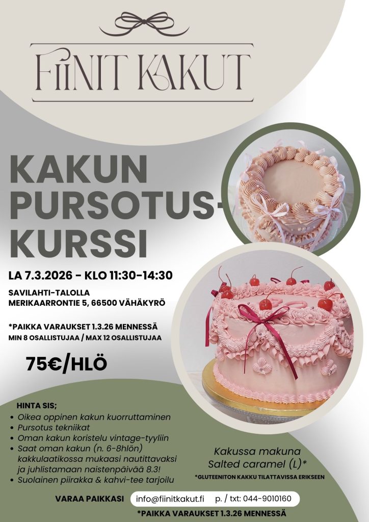Kurssin hinta on 75 €/hlö ja se sisältää opetuksen lisäksi kaikki tarvittavat materiaalit, oman kakun mukaan vietäväksi sekä suolaisen piirakan ja kahvi–tee tarjoilun. Paikkoja on rajoitetusti (min. 8 / max. 12 osallistujaa), joten varaa paikkasi viimeistään 1.3.2026.